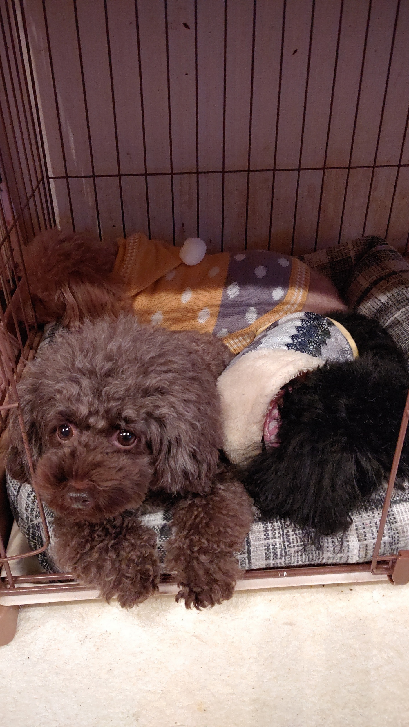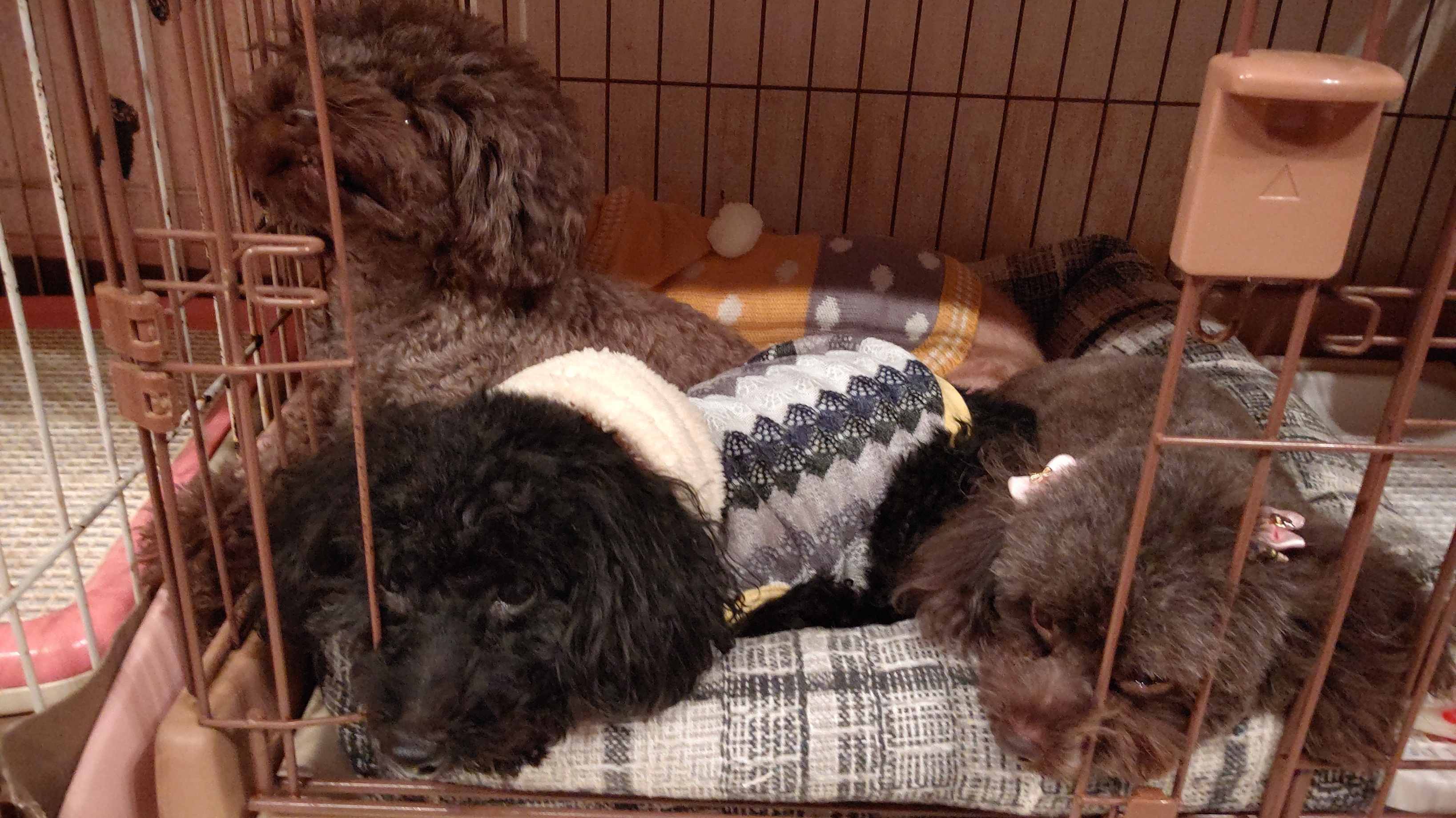 毎日のゲージお掃除中は、ワンコたちの、お遊びタイムですが、ベテラン ママたちはなぜか・・・狭いところに、入って寝てる・・・
