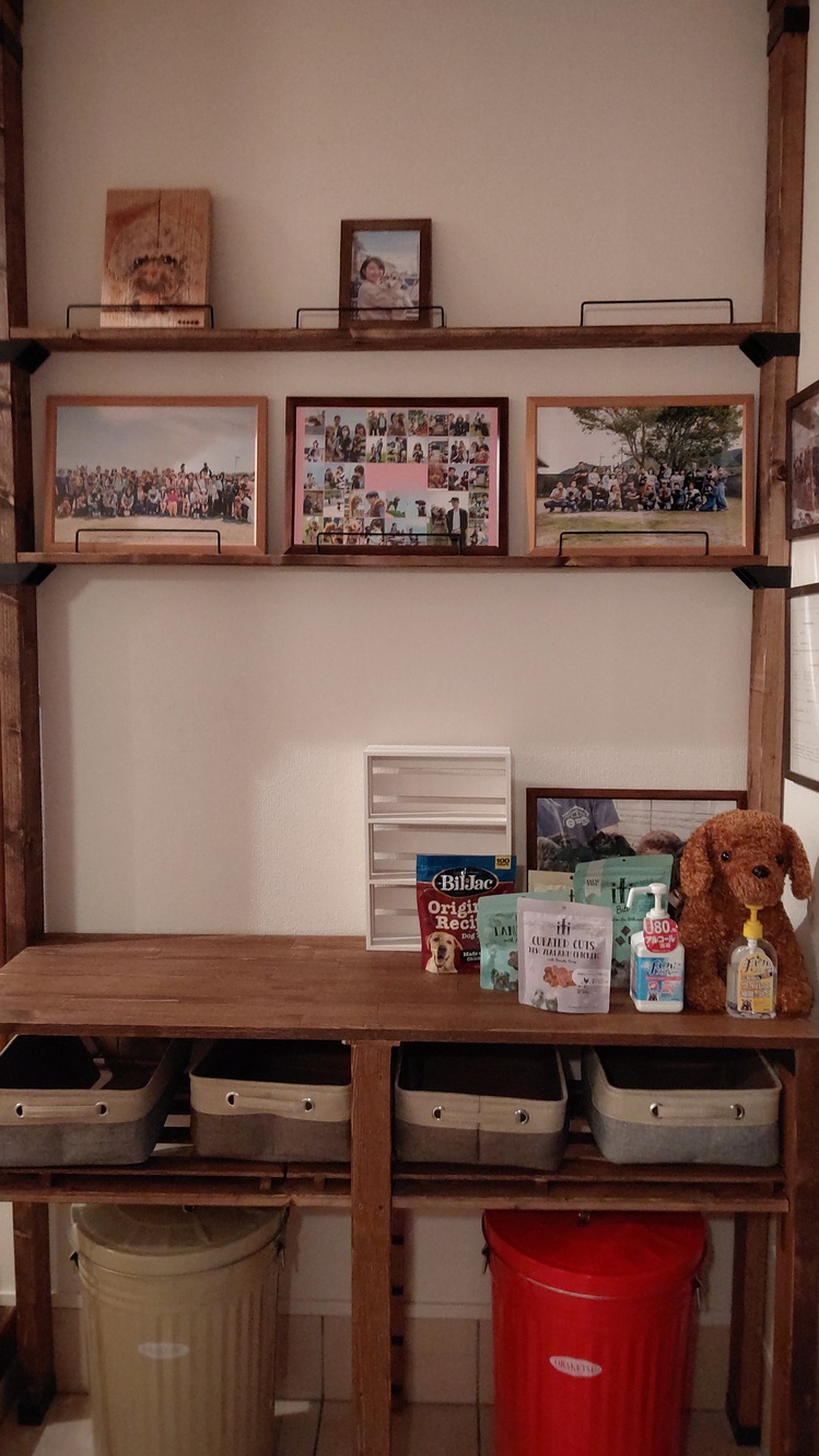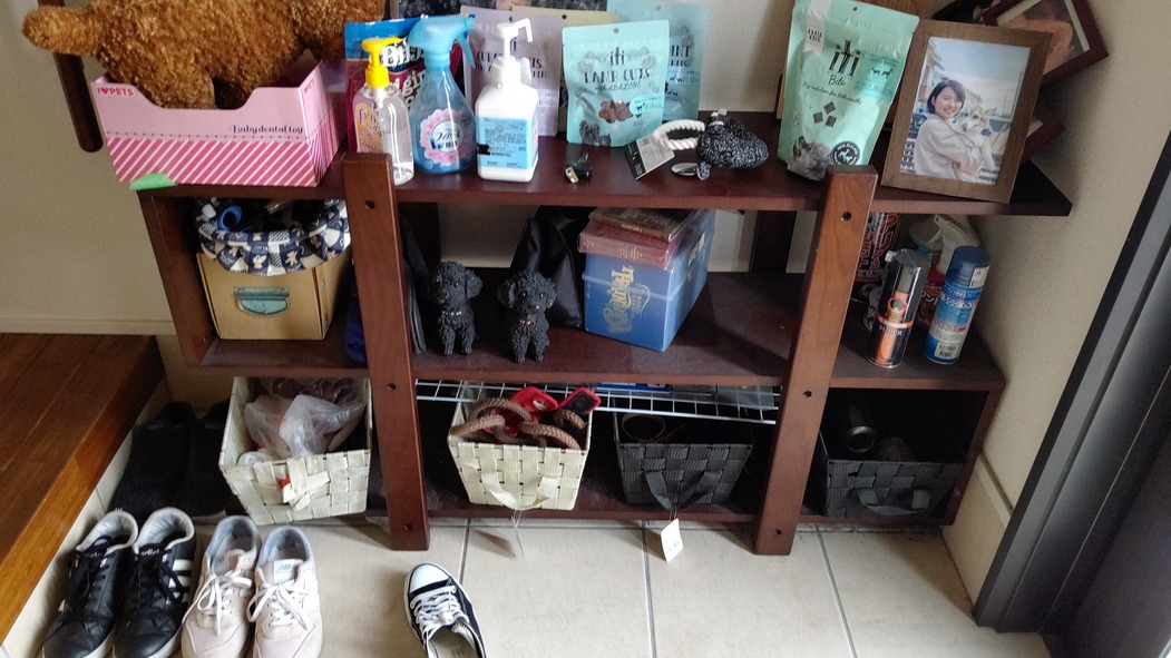 日曜日は、ごちゃごちゃしていた玄関用に友人ご夫婦手作りの、棚を設置してもらいました