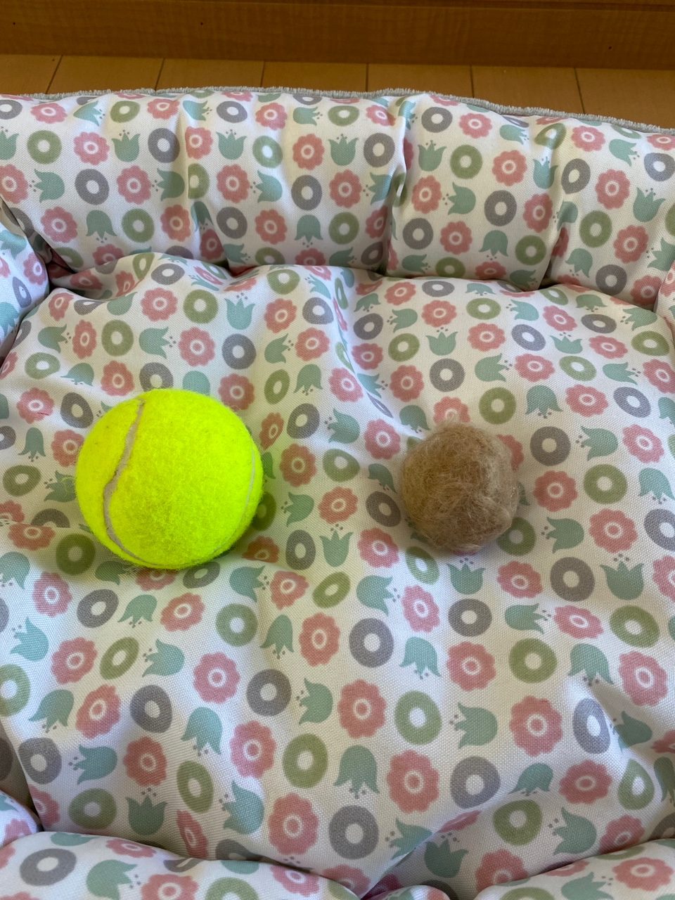 今回のカットでは、毛を集めてボールにしてみました。さくらの毛です。けっこうカチコチのボールが出来てびっくり。わんこたちはテニスボールより毛玉ボールに興味深々でした。